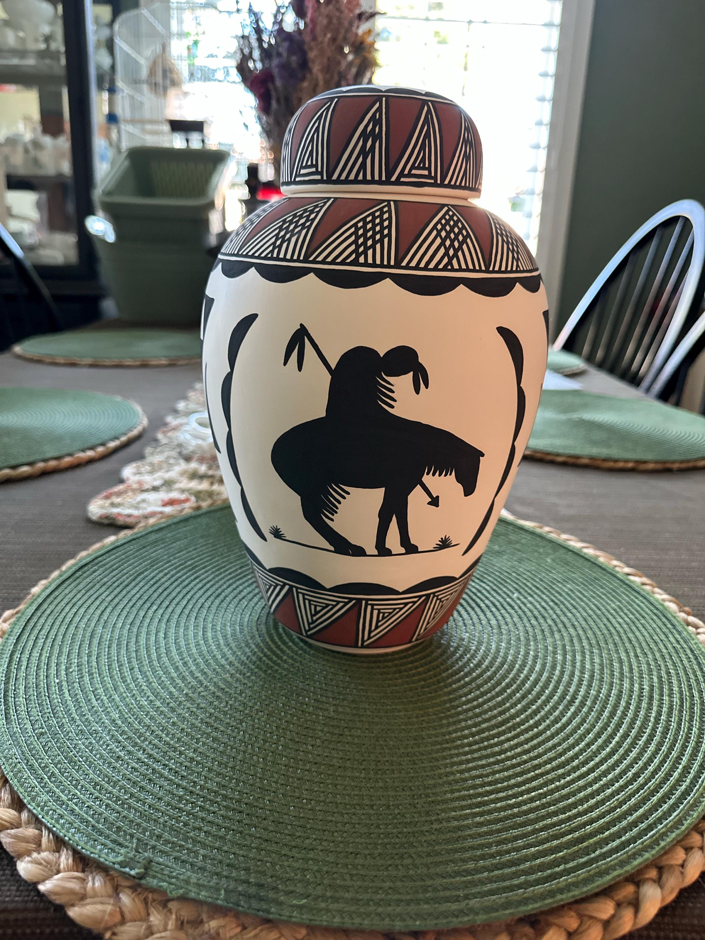 End of the trail design adult cremation urn done in traditional colors of terracotta and black on white clay by a Native American artist. Traditional design large ceramic jar for human ashes. This covered container is a unique piece of artwork which can be used for display or a container for ashes.