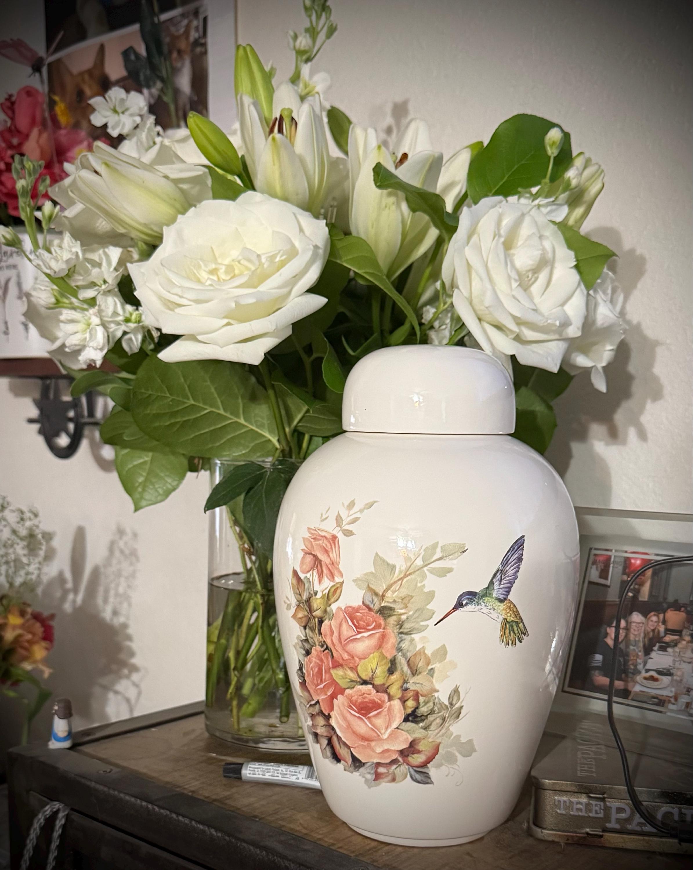 Peach Roses on Adult Cremation Urn, Human Ashes Urn, Large Ceramic Ginger Jar with Lid. Large Memorial or Funeral Urn, Large Pet Urn, This urn is suitable for the cremains of a loved one with a healthy weight of up to 190 pounds. This Vessel is designed as a cremation urn to honor a life lived.
