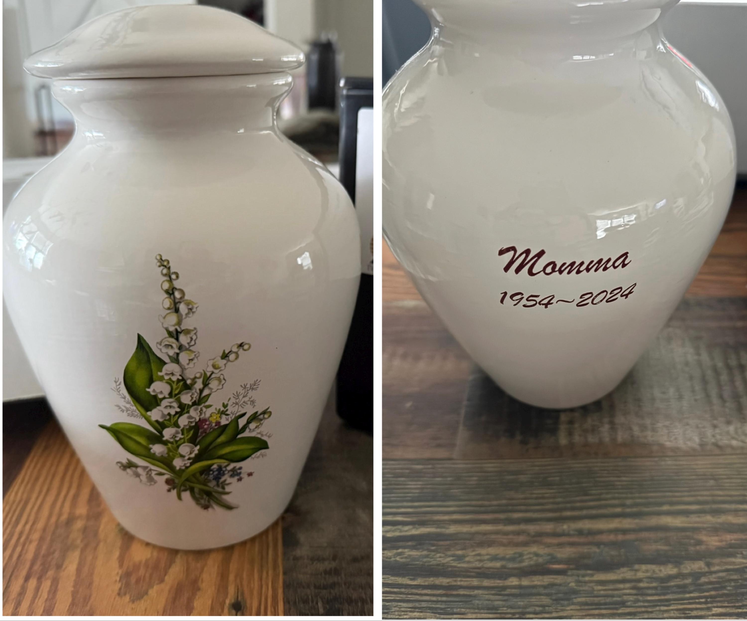 The urn is absolutely beautiful. Lily of the Valley was mom’s favorite flower. Wish you had small ones.